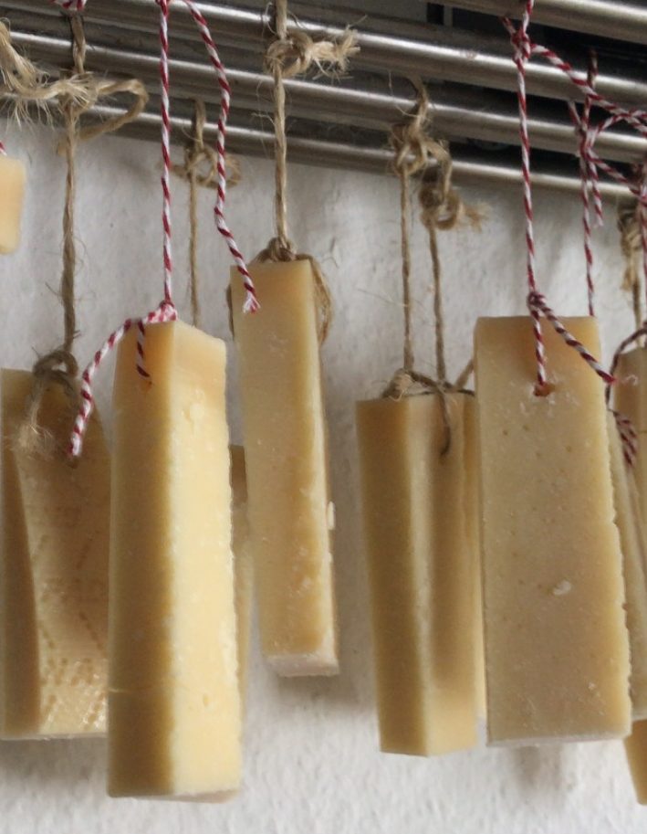 Ich bohre dann ein Loch in den Käse, so dass eine Kordel hindurch passt, und hänge sie dann an einem gut belüfteten Ort, bei mir z.B. in der Küche, für 2 bis 3 Wochen auf, bis sie komplett durchgetrocknet und entsprechend Hard sind.